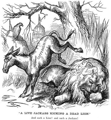 A Thomas Nast cartoon titled, A Live Jackass Kicking a Dead Lion, was printed in Harper's Weekly on this date.